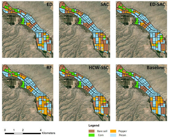 Classification maps of five different classification methods and baseline map (Euclidean distance (ED), spectral angle cosine (SAC), Euclidean distance–spectral angle cosine (ED-SAC), random forest (RF), and a new hybrid changing-weight classification method with a filter feature selection (HCW-SSC)).