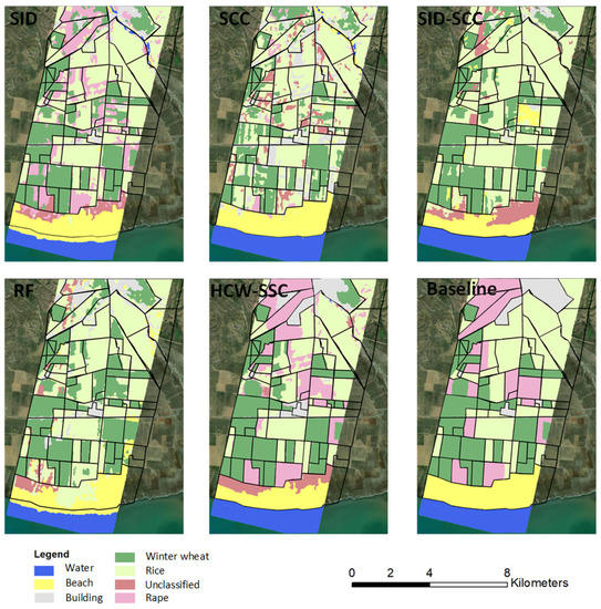 Classification maps of five different classification methods and baseline map (spectral information divergence (SID), spectral correlation coefficient (SCC), spectral information divergence–spectral correlation coefficient (SID-SCC), random forest (RF), and a new hybrid changing-weight classification method with a filter feature selection (HCW-SSC)).