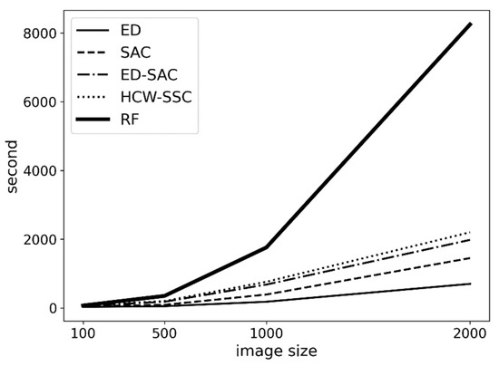 The time consumption of different kernels is based on different image sizes (Euclidean distance (ED), spectral angle cosine (SAC), Euclidean distance–spectral angle cosine (ED-SAC), a new hybrid changing-weight classification method with a filter feature selection (HCW-SSC), and random forest (RF)).