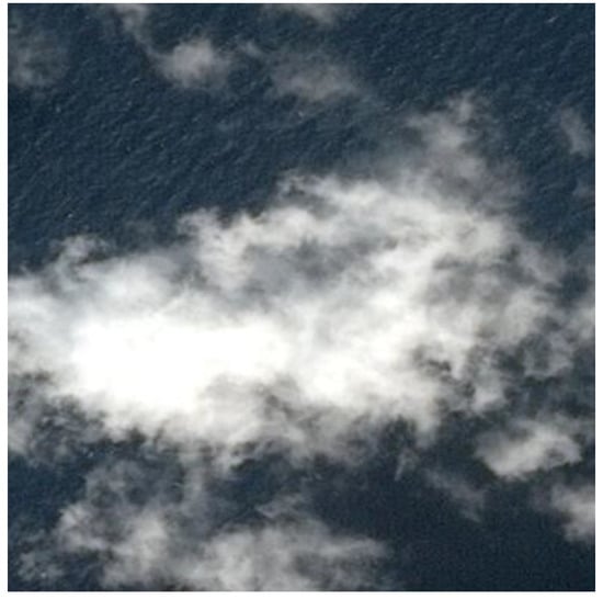 The dataset used in this paper is from the Kaggle platform Airbus Ship Detection Challenge [43]. The dataset has RGB images with the resolution of 768 × 768 pixels. It also includes the encoded pixels in satellite photos that represent ship locations. The decoded pixels were transformed into binary masks, with 1 representing “ship” and 0 representing “no ship”. If a mask with value 1 exists, it is converted to a bounding box by computing the mask’s four corner coordinates. All photos were resized to 256 × 256 pixels in order to save computing power. The axes in the original data were inverted, hence the x and y coordinates were flipped as well. The figures below (Figure 2 and Figure 3) are an example of an image with ship and without ship. Because this dataset consists of a vast number of images, only satellite images with at least one ship were used, resulting in approximately 47,259 satellite images. However, due to the high processing time and memory consumption constraints, we could only manage up to 10 K dataset images, 7000 images as the training images, and 5000 images as the test images from the entire dataset, which were used to test and evaluate the model’s performance.