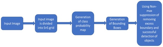 In YOLOv1 image is divided into equal-sized S × S grid cells. If the centre of the items falls inside the cell, then object detection take place on each grid cell. With a confidence score, each cell may anticipate a bounding box with a fixed B number. 5 values such as x, y, w, h, and confidence scores make up each bounding box [52,53]. The centres, width, and height of the bounding box are represented by respectively x, y, w, and h. After predicting a bounding box, IOU (intersection over union) is used by YOLO to find the correct bounding box of an object for the grid cell. Non-max suppression is used by YOLO to reduce extra bounding boxes. If the IOU >= 0.5, then the extra bounding boxes with low confidence score are removed by non-max suppression. The sum of squared error is used by the YOLO to determine loss.