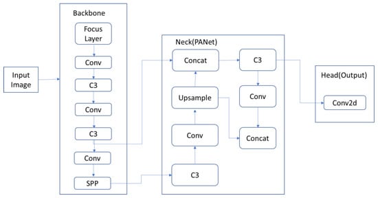 In YOLOv5, the first three layers of YOLOv3 are replaced by the single Focus layer. Furthermore, there is a convolution layer denoted by Conv. There are three convolution layers denoted by C3 and a module that is connected by bottlenecks. The network’s fixed size constraint is removed by the SPP (spatial pyramid pooling) pooling layer, upsam-pling the previous layer fusion in the adjacent node. Concat is a slicing layer that slices the layer before it. The last three Conv2d modules are detection modules that are employed in the network’s head.