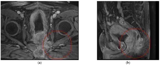 (a) MRI of the small pelvis with intravenous amplification—frontal projection; (b) MRI of the pelvis with intravenous enhancement—sagittal view (zone of tumor is circled).