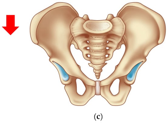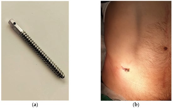 (a) Titanium pin with the zone for marker attachment; (b) View of patient with implanted pin; (c) Bone reference point—anterior superior iliac spine on the right.