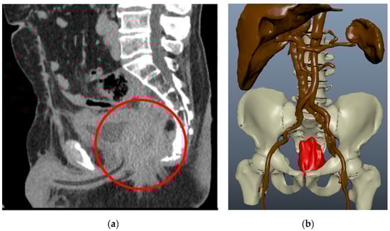 (a) CT scan of the pelvis with intravenous enhancement. Tumor size 50 × 71 × 71 mm, with signs of spread to the lower parts of the ureters, the wall of the bladder, and the coccygeal vertebrae (highlighted in a circle); (b) 3D model of pelvic organs and vessels. Implanted pin at the right side.