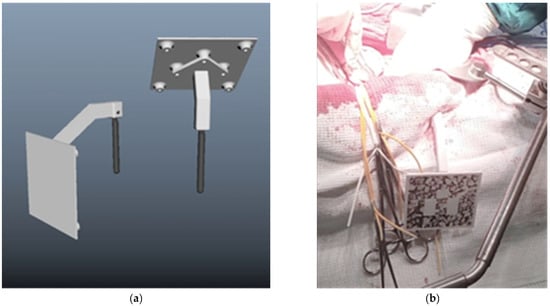 (a) Two configurations of the marker for augmented reality; (b) Sterilized and installed marker of the first (“abdominal”) configuration.