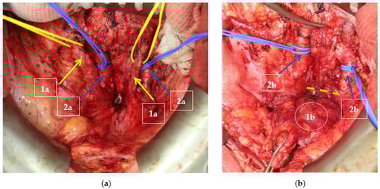 (a) Intraoperative view of the pelvis. Performed control of bleeding. 1a—ureters; 2a—common iliac arteries; (b) Resection of the ureters was performed, the bladder was mobilized, and the border of the tumor was determined using augmented reality technology. 1b—mobilized bladder; 2b—common iliac arteries. The boundary of the tumor invasion into the sacrum is indicated by a ligature and a dotted line.
