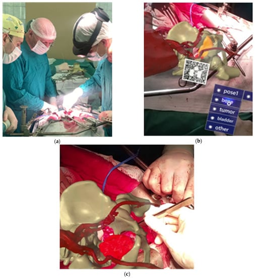 (a) Surgeon at work with augmented reality glasses; (b,c) Visualization of the 3D anatomy model and physician interface in the augmented reality glasses.