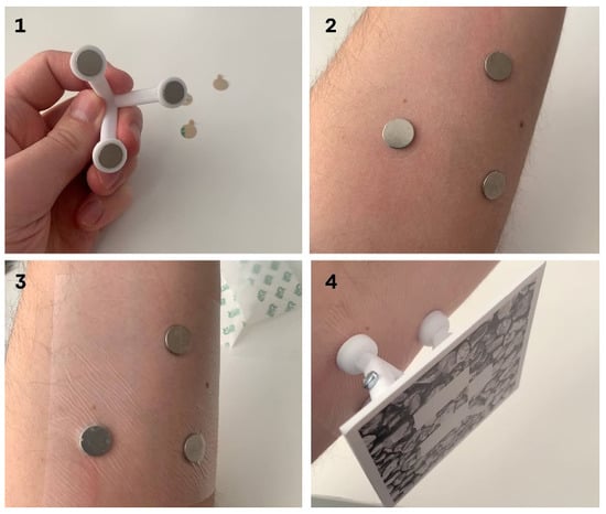 This approach has a number of significant advantages. First of all, it is noninvasive and it gives the ability to install a marker in any anatomical zone. Due to the sufficiently strong degree of fixation of the magnets, the installation site can be covered with sterile material and the marker can be placed on top (Figure 10).