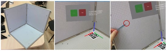 To assess the positioning accuracy of holograms in the augmented reality mode, a stand was designed consisting of three mutually perpendicular planes with millimeter markings applied on each of them. The size of the working area of the stand is 400 × 400 mm. The base itself was assembled on the basis of a metal frame with the ability to adjust the offset and inclination of each plane. Calibration and correction of the position of the planes was done using measuring tools: a square and ruler with a high accuracy class.