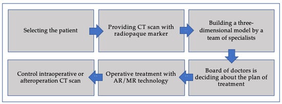 The subsequent parts of this paper are organized as follows: Section 2 includes ethics-related statements, descriptions of research methods, clinical and technical aspects of the research material, and our algorithm of practical AR/MR. Section 3 contains a description of the action of our team regarding a surgical AR/MR application. Section 3.1 and Section 3.2 contain descriptions of clinical cases, with underlining of difficulties and obstacles we encountered in the practical use of AR/MR. Section 3.3 contains data concerning the accuracy of AR/MR in this series. Section 4 summarizes the paper as a whole and details its novel contributions.