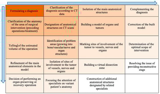 Using the method of augmented and mixed reality, we performed surgical interventions (8 clinical cases) in patients with cancer of the abdominal region (7) and with postoperative complications. Each clinical case was analyzed by a multidisciplinary team, the result was the construction and application of a situation-specific three-dimensional model. The team included a surgeon, a radiology specialist, an engineer, and related specialists (vascular surgeon, neurosurgeon, etc.). For the preoperative planning and constructing 3D model of the patients, we designed the algorithm that is presented in Scheme 2. This is one of the key steps, where segmentation of anatomical structures is performed using stage-by stage analysis of the CT data.