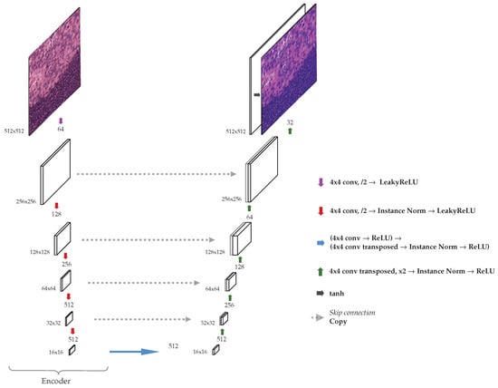 Each convolution applied reduces the size of the image by a factor of 2. After each convolution, an instance normalization layer was used, and after the normalization, LeakyRELU activation function with a negative slope equal to 0.2 was applied. For upsampling in the decoder transposed convolutions were used, with the same hyperparameters: kenel–size 4, stride 2, and padding 1. Furthermore, instance normalization layer and LeakyReLU were applied in each block in the decoder.