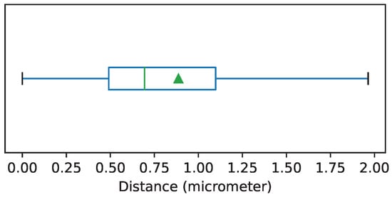 Boxplot showing the distribution of the average distances between control points after image registration. Each box is drawn from the first to the third quartile. The horizontal line represents the median value, and the triangle represents the mean. The whiskers indicate the minimum and maximum value of the distribution.