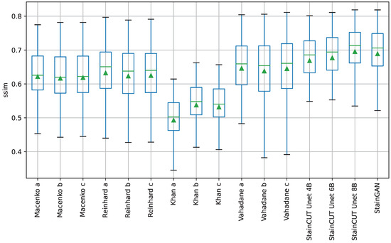 Boxplots from the evaluation of the SSIM metric for all compared methods on the MITOS-ATYPIA dataset. Each box is drawn from the first to the third quartile. The horizontal line represents the median value, and the triangle represents the mean. The whiskers indicate the minimum and maximum value of the distribution.