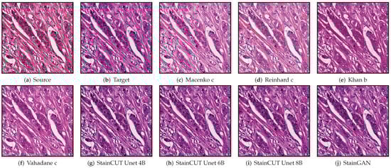 For comparison, four state–of–the–art methods were evaluated using public implementations: Macenko (https://warwick.ac.uk/fac/cross_fac/tia/software/sntoolbox/) (accessed on 13 July 2022) [12], Reinhard [9], Khan [10], and Vahadane (https://github.com/abhishekvahadane/CodeRelease_ColorNormalization) (accessed on 13 July 2022) [14].