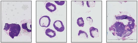 Our aim with this set of experiments is to evaluate the impact of using stain normalization in the context of semantic segmentation for the detection of breast cancer metastasis in lymph nodes. We trained a binary semantic segmentation model on WSIs from the CAMELYON16 (https://camelyon16.grand-challenge.org/) (accessed on 13 July 2022) dataset [30]. The WSIs come from two different medical centers in the Netherlands: Radboud University Medical Center (RUMC) and Utrecht University Medical Center (UMCU). An example of digitized slides from these centers can be seen in Figure 7 and Figure 8.