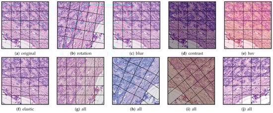 We performed two experiments, and in each of them, we used the slides of one of the centers to train a segmentation network, whereas the other center was used for testing. To perform the binary semantic segmentation, a standard UNet [25] with a ResNet18 [31] encoder was used. The network was not pretrained with other data beforehand. To create the training dataset, we sampled patches at a magnification of 20×, with a size of 512 px × 512 px. In all cases, the network was trained using data augmentations, which included a composition of several elastic, flip, rotation, Gaussian blur and noise, fog, HSV color shift, brightness, and contrast transformation; see Figure 9.