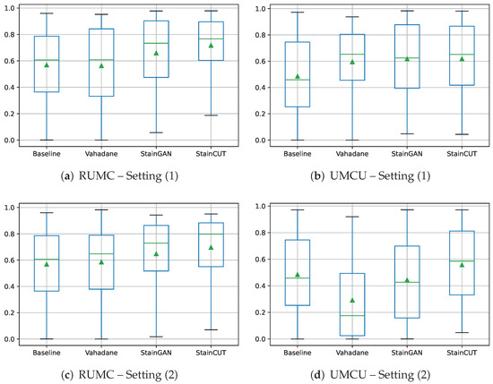 The StainGAN and StainCUT methods were trained with the same hyper-parameters as described in Section 4. For the StainCUT, we used eight blocks in the generator, i.e., StainCUT UNet 8B. For the Vahadane method we used a mosaic of tiles, each of size 128 px × 128 px. In Setting (1), the data augmentations were applied to the training patches after applying the stain transfer. Additionally, we trained the segmentation network using only data augmentations without any stain transfer to validate whether using the stain transfer indeed improves the performance of the model.