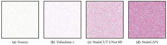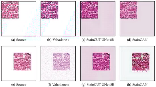 Training the StainGAN with images of size in our graphics card was not possible due to insufficient memory, not even with batch size 1; however, it was possible with the StainCUT method with batch size 4. The StainGAN method was trained then on images of size with a batch–size of 2, and the rest of the hyperparameters were the same as the ones used for the StainCUT training. In the StainGAN paper [19], the authors reported training the method with images of size with a batch size of 4 in a graphics card with a memory size of 12 GB. The classical methods can stain images with the dimensions of the frames at level of magnification; however, training the deep-learning approaches with images from that size was not possible due to insufficient memory in the graphics card.