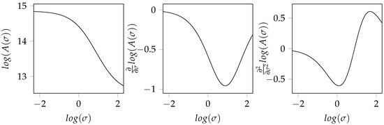 In this way, the amplification of the high-frequency components of the signal is eliminated. The approximation of the surface relation that was numerically derived in Figure 1 is shown in Figure 2 together with its first and second analytically calculated derivatives. In order to obtain repeatable estimates of the scale exponent, the slope at the turning point of the sigmoid approximation is applied, as it can be calculated by Equations (4) and (5).