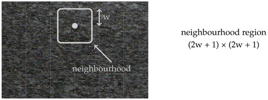 In principle, an image not only consists of a homogeneous structure, but unites different textures of different scale behavior. Hence, the calculation of one global scale exponent for the entire image is often not suitable for detailed analyses. In order to tackle this issue, scale-space filtering can be adapted to selected parts of the image, allowing for the estimation of local fractal characteristics. Performing the analysis on a grid-like structure as depicted in Figure 4 results in a scale exponent field, giving the spatial fractal characteristics of the image. The quadratic neighborhood region around the central grid point defines the local evaluation region. The grid size enables an adjustment according to the resolution of the image.