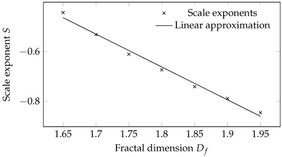 Figure 5 shows five exemplary textures generated with Gwyddion using Hurst exponents between and . The Hurst exponent H is directly related to the fractal dimension [31]. Calculating the scalar exponent via the proposed method in Section 2, the relationship between the scale exponent and the Hurst exponent or the fractal dimension can be obtained. The results are visualized in Figure 6, depicting an approximately linear relationship between the fractal dimension and the scale exponent S. In this sense, the scale exponent can be seen as a fractal indicator. The proposed evaluation method is implemented in MATLAB.