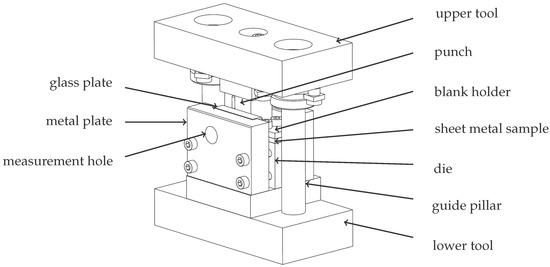 The test setup for the shear cutting experiment is shown in Figure 7. The tool consists of an upper and a lower tool part, which are positioned to each other via guide pillars. Between the upper and lower tool, the sheet metal sample is clamped on a die by means of a blank holder. The punch is mounted above the die in the upper tool. With the vertical movement of the upper tool, the punch lowers onto the specimen and separates the sheet metal. The metal plates serve to fix the specimen to the side. The glass plate placed between the specimen and the metal plate is necessary to ensure the observation of a plane strain state through the measuring hole [39].