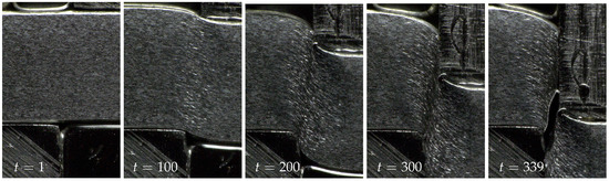 The deformation of the sheet metal edge surface is observed through the measurement hole with a mobile microscope of type Keyence VHX (Osaka, Japan). In order to ensure proper data storage, the experiment was stopped several times. Figure 8 shows some representative images of this experiment. In case of the shear cutting experiment shown in Figure 8, a sample sheet metal of mild steel S355MC with a thickness of 4 mm was used. Further sample preparation was performed by etching the ground edge surface in order to bring out the grain structure of the material. This grain structure not only provides the basis for the subsequent fractal analysis, but also acts as a speckle pattern for calculating the displacements using digital image correlation (DIC) [40,41,42]. The etched sheet metal samples were separated using low punch speeds of 10 mm/min. The time references given at the lower edge of the images in Figure 8 serve the purpose of assigning the deformation to the scale exponent values of the result part. With , the first analyzed image is referred to.