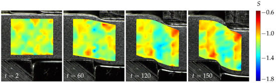 In order to analyze the qualitative progression of the scale exponent field over the course of the shear-cutting process, the fractal analysis was combined with a displacement calculation using DIC, where the abort of the DIC routine leads to the end of the entire evaluation. More information on the DIC approach used can be found in Refs. [41,42]. Figure 9 depicts the scalar exponent fields for the region of interest (ROI) defined in the leftmost image. Due to reflections caused by the deformation of the sheet metal sample, especially in the shear region, the deformation estimation suffers from calculation artifacts. Additionally, the intermittent character of the experiment and the change in illumination on the resumption of the experiment cause those difficulties. However, since the artifacts are limited to the marginal areas, a meaningful assessment of the scale space behavior is still possible. In the case of the unloaded state, i.e., the leftmost image of Figure 9, the scalar exponent values are distributed in a relatively homogeneous manner, exhibiting values around . In the following time step that is depicted, nests with decreasing scale exponent values of are formed at the upper and lower edges of the shear zone. These nests merge to a vertical region that extends along the shear zone in the further progress of the shear-cutting experiment. For laterally adjacent regions, the scale exponent values are increased slightly. Toward later time steps, i.e., the rightmost image depicted in Figure 9, the scale exponent values of the shear region increase slightly. Nevertheless, the shear region is well separated from the undeformed regions by the difference in scale exponent values. From time step t = 60 onward, a certain point symmetry of the scale exponent values to the center of the shear zone can be noted. This symmetry may have its origin in the boundary conditions, resulting from the shear-cutting process.