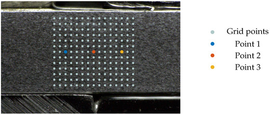 With these dimensional images of the scale exponent field, only an estimation of the development of the spatial distribution of the scale exponent values but no exact statement can be made about the temporal course of the values of individual material points. Hence, in order to evaluate the fractal behavior over the course of the shear-cutting process, three exemplary points were picked—one located in the shear zone, one in the fixed material zone and one in the material zone that is pressed into the die. The selected points are depicted in Figure 10.