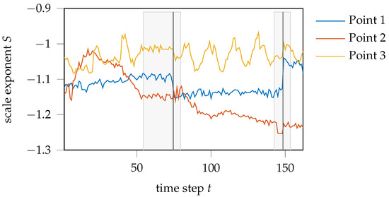 In general, a huge difference between the courses of the three points is recognizable. While the scale exponent curve of the point lying in the fixed material area (point 1) remains almost constant, the temporal course of the scale exponent of the point pressed into the die (point 3) forms a sawtooth-like profile for later time steps. This profile is particularly pronounced from time step onward. Similar to the scale exponent progression of point 1, the time progression of point 3 remains constant on average. In contrast, the scale exponent of the point lying in the shear zone (point 2) increases at the beginning up to a time step of . Afterward, ignoring the gray-shaded regions in which no punch movement, and hence, deformation took place, the scale exponents decrease almost continuously until . Toward the end of the depicted time series, the values of point 2 also reach an about constant plateau.
