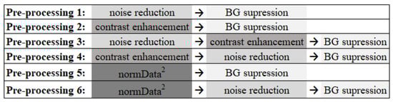 The six preprocessing methodologies implemented in order to reduce noise and amplify the visibility of the MCs (BG: background, normData: data normalized between 0 and 1).