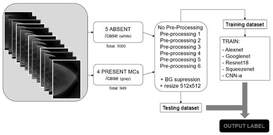 Figure 3 shows the pipeline followed in this work. Absent and presentMCs data samples were selected, and the described preprocessing techniques were applied. The training dataset was used to train the CNNs from scratch, and the testing dataset was used after training to evaluate the performance of the trained CNNs.