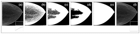 All the steps involved in the BG suppression are presented through an example case in Figure 4. The original data were first binarized (Figure 4b) by thresholding, the holes in the image were filled (Figure 4c), the largest resultant object was selected (Figure 4d), and the complete binary mask was achieved by performing region growing in (Figure 4e). The profile traced for the white ROI (lower right corner of (a) and (f)) shows the cleaning effect.