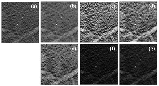 (a) Original data without preprocessing; (b) preprocessing 1 (minimization of TV); (c) preprocessing 2 (CLAHE); (d) preprocessing 3 (minTV + CLAHE); (e) preprocessing 4 (CLAHE + minTV); (f) preprocessing 5 (dataNorm2); (g) preprocessing 6 (dataNorm2 + minTV).