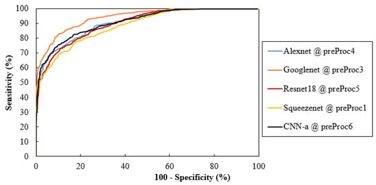 Comparisons of ROC curves for the CNNs and training data with the best AUC values; preProc—preProcessing.