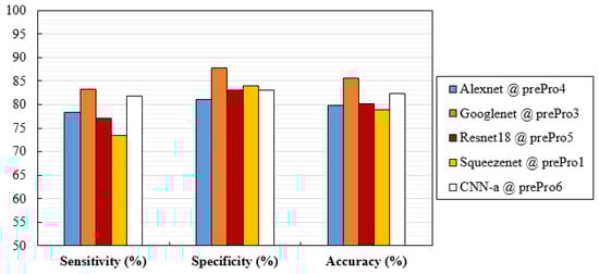The variations and differences in AUC values obtained for each situation were, in general, in agreement with the specificity, sensitivity, and accuracy values obtained in Figure 7. Although specificity values were higher than sensitivity in most cases, these differences were not significant (p-value > 0.05 in all cases). As for accuracy, GoogLeNet and CNN-a presented the best values of 85.68% and 82.45%, respectively.