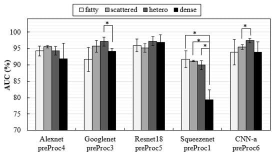 AUC values obtained with test datasets composed by the four different breast densities separately (* indicates a significant difference between groups).