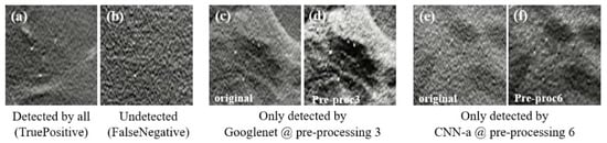 Some examples of MCs in the DBT data used. (a) True positive (case correctly classified as positive by all CNNs, even in the original image); (b) false negative (case incorrectly classified as negative by all CNNs, even when varying the preprocessing); (c) original case classified as negative and that was only detected by GoogLeNet when preprocessed with method 3 (d); (e) original case classified as negative that was only detected by CNN-a when preprocessed with method 6 (f).