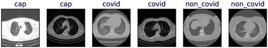 To build the classification dataset, data from two public repositories was collated. The first dataset was sourced from Kaggle [60,61]. This dataset comprises a multi-nation collection of curated COVID-19 CT scans from 7 public sources [62]. This dataset contained 7593 curated images from 466 patients that were diagnosed with COVID-19, 6893 images from 604 patients that were considered as healthy with normal lungs, and 2618 images from 60 patients diagnosed with community-acquired pneumonia (CAP). The second dataset was sourced from Mendeley Data [63] and contained COVID-19 and common pneumonia (CP) CT scans. From this dataset only used 328 CP images which were merged with the CAP images were used. Figure 1 shows some representative images of COVID-19, CAP and Non-COVID (normal lungs) from the collated dataset. The dataset was split by class stratification to ensure all subsets had the same number of images from the minority class “CAP”. The split ratios were 80:10:10 for training (13,945 images), validation (1743 images) and test (1744 images), respectively. Table 2 shows the number class instances per subset.