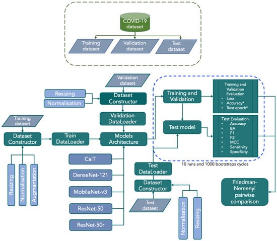 With these, 20 experiments were built and evaluated (5 × 2 × 2) by training CaiT, DenseNet, MobileNet-v3, ResNet-50, ResNet-50r to minimise CE and wCE with Adam or AdamW (Table 3). Figure 2 illustrates the pipeline approach to classification and comparison of the models in out experimental setup. All experiments were implemented in PyTorch Framework and run on google Colab Pro and Pro+. The code is available on an as-is basis on the following github repository: https://github.com/ace-aitech/COVID-19-classification (accessed on 4 August 2022).