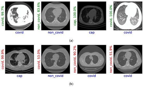 Illustration of results (horizontal label) with their prediction and probability score (vertical label). (a) Correct predictions. (b) Misclassifications.