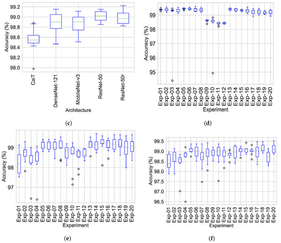 Table 6 summarises the performance metrics during the test phase by network prior to bootstrapping. The average performance of each network for all evaluation metrics was in the following descending order: ResNet-50, ResNet-50r, DesNet-121, MobileNet-v3 and CaiT (Figure 4). The five networks reached an average performance of over 98% for the 7 evaluation metrics, except for CaiT, which showed an average of . ResNet-50 achieved values over in six of the seven evaluation metrics, followed by ResNet-50r which hit the the highest F and F scores and the same average performance than ResNet-50 in and . It was observed that the , , and Sens presented very close values to each other when evaluating the performance of the architectures (Table 6). The MCC suggests that there is high correlation among the predictions and their real class and reflects the impact of the class imbalance [81]. In addition, from the metrics by experiment it was noted that, Exp-18 and Exp-20 obtained the highest values from all experiments for all metrics followed by Exp-05 and Exp-15 (Table 7). Exp-03 and Exp-04 showed the largest standard deviation in three and four of the evaluation metrics, respectively.
