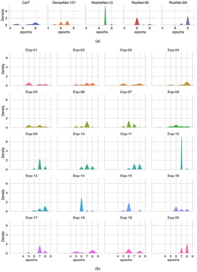 Epochs required to reach the maximum validation accuracy. (a) Epochs by architecture. (b) Epochs by experiment (CaiT experiments 1–4, DenseNet experiments 5–8, MobileNet experiments 9–12, ResNet-50 experiments 13–17, ResNet-50r experiments 17–20).