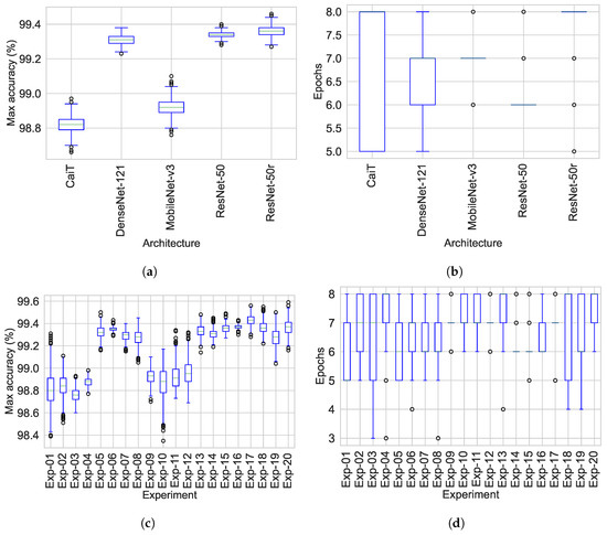 Maximum training accuracy and training epochs to reach the maximum accuracy after 1000 bootstrap cycles. (a) Max accuracy by architecture. (b) Max accuracy by experiment. (c) Epochs required to reach the maximum accuracy by architecture. (d) Epochs required to reach the maximum accuracy by experiment. CaiT experiments 1–4, DenseNet experiments 5–8, MobileNet experiments 9–12, ResNet-50 experiments 13–17, ResNet-50r experiments 17–20.