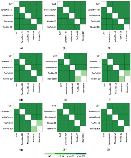 Nemenyi post hoc rankings pairwise of the by network for each of the performance metrics. The comparison was done for all metrics, the maximum accuracy during training and the epoch at which the maximum accuracy was reached. The comparison carried out after 1000 bootstrap cycles. (a) Accuracy. (b) Balanced accuracy, (c) F1 score, (d) F2 score, (e) Matthew’s correlation coefficient. (f) Sensitivity. (g) Specificity. (h) Maximum validation accuracy. (i) Number of epochs required to reach the maximum validation accuracy. NS stands for no significant difference.