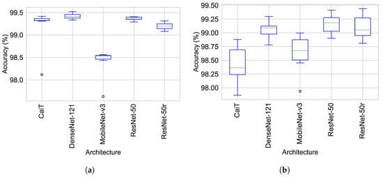 Table 6 summarises the performance metrics during the test phase by network prior to bootstrapping. The average performance of each network for all evaluation metrics was in the following descending order: ResNet-50, ResNet-50r, DesNet-121, MobileNet-v3 and CaiT (Figure 4). The five networks reached an average performance of over 98% for the 7 evaluation metrics, except for CaiT, which showed an average of . ResNet-50 achieved values over in six of the seven evaluation metrics, followed by ResNet-50r which hit the the highest F and F scores and the same average performance than ResNet-50 in and . It was observed that the , , and Sens presented very close values to each other when evaluating the performance of the architectures (Table 6). The MCC suggests that there is high correlation among the predictions and their real class and reflects the impact of the class imbalance [81]. In addition, from the metrics by experiment it was noted that, Exp-18 and Exp-20 obtained the highest values from all experiments for all metrics followed by Exp-05 and Exp-15 (Table 7). Exp-03 and Exp-04 showed the largest standard deviation in three and four of the evaluation metrics, respectively.
