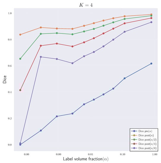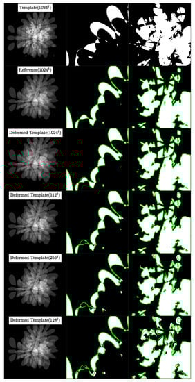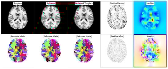 where . We set the template and the reference base image size to . It is important to note that and possess only the discrete intensities . This allow us to naturally define ten labels and , corresponding to and , respectively, for all image voxels with intensity i for each . We show a 2D slice of the template and reference images for the case in Section 5.3. The scripts for generating the template image and the synthetic velocity field can be found at https://github.com/naveenaero/scala-claire (accessed on 5 January 2022). The reference image can be generated using CLAIRE [,].