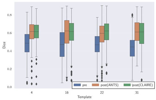 - Avants, B.B.; Tustison, N.J.; Song, G.; Cook, P.A.; Klein, A.; Gee, J.C. A reproducible evaluation of ANTs similarity metric performance in brain image registration. NeuroImage 2011, 54, 2033–2044. [Google Scholar] [CrossRef]
